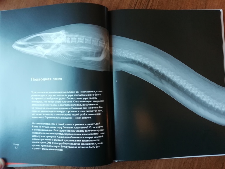 Обсудили отличие змей и угрей, как раз на этом рентгеновском снимке очень хороши видны плавники угря.