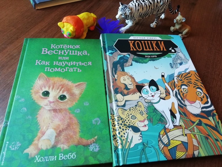 Она купается с фигурками кошек, играет с ними, читает книги про кошек, рисует кошек, лепит кошек и обожает все, что связано с кошками.