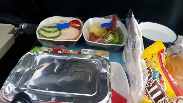 Горячее пюре с куриными нагетсами. Дочка съела 1 нагетс и фрукты, остальное доели мы с мамой. Цена детского 608 руб. Заказывать заранее надо. На борту не купите. Дают только воду без газа.
