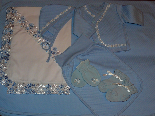 Конечно, хотелось избежать голубого цвета!! Но наборчик уж очень подошел по цене, качеству и комплектации: пледик, красивый уголок, чепчик, распошоночка, и самое интересное-вместо ползунков или бодика вот такой забавный мешочек (ножками подрыгать