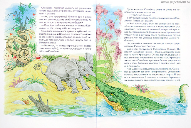 Иллюстрации к книге хороши, хорош и перевод классических сказок. Но по тексту у современного искушенного читателя могут быть и придирки. Например, я хорошо помнила сказку о слоненке, который очень хотел знать, что ест на завтрак крокодил, и как именно он заполучил свой длинный хобот. Но совершенно не представляла, что в каждой третьей строчке упоминаются тумаки, пинки и прочие издевательства над любопытным слоненком. И мне трудно объяснить ребенку факт регулярного избиения бедного слоника. Тем не менее, это классика, и кто-то может заметить, что дети не так переживают подобные моменты в книгах, как мы. В конце-концов, обретя хобот, слоненок показал всем, что теперь он больше не мальчик для биться.