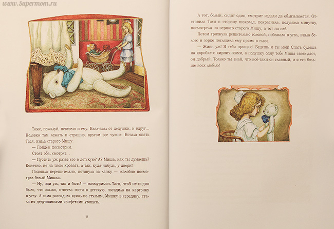 Это сборник небольших повествовательных рассказов о жизни шестилетней девочки Таси, ее плюшевом мишке и дружной семье. Иллюстрации к книге выполнены в винтажном стиле иллюстратором Людмилой Пипченко, с творчеством которой у меня неоднозначные отношения: где-то я радовалась, а где-то разочаровывалась, но иллюстрации к этой книге достойны отдельной похвалы, все очень выдержано, они словно дореволюционные открытки с подписями на пожелтевшей старой бумаге. Что интересно, иллюстрации к этой книге были созданы спустя ровно сто лет после написания самой книги.