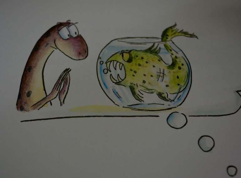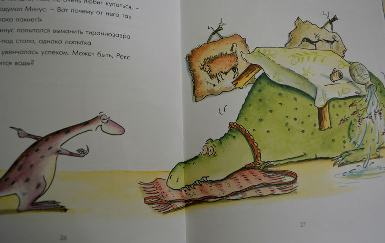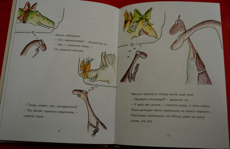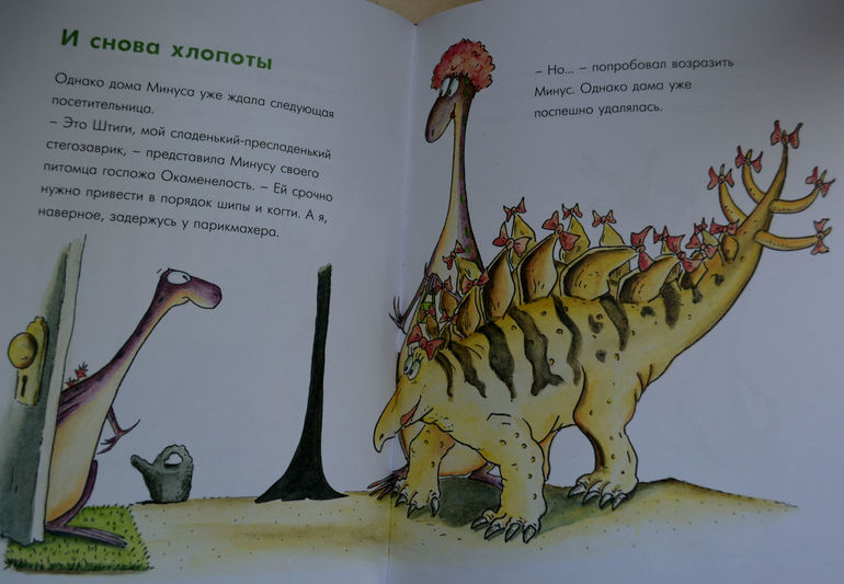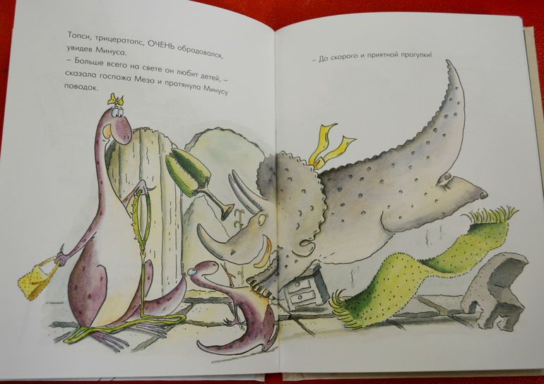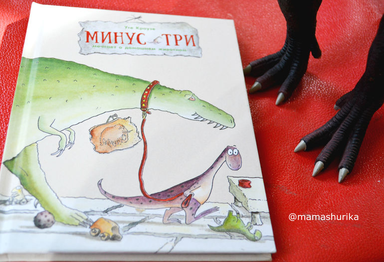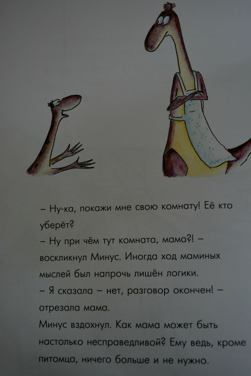 эта книга нам очень понравилась! Она добрая, смешная , даже я бы сказала ироничная, поучительная и вообще очень, очень приятная. Для нас ещё и актуальная тема. Сюжет такой: маленький динозаврик по имени Минус мечтает о домашнем питомце, ну хотя бы о вот такой милой первобытной рыбке.