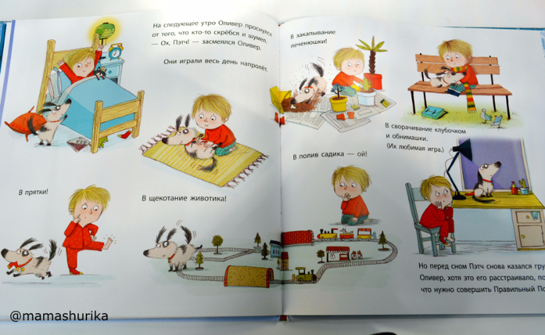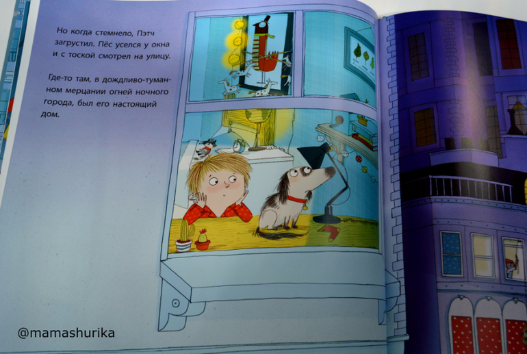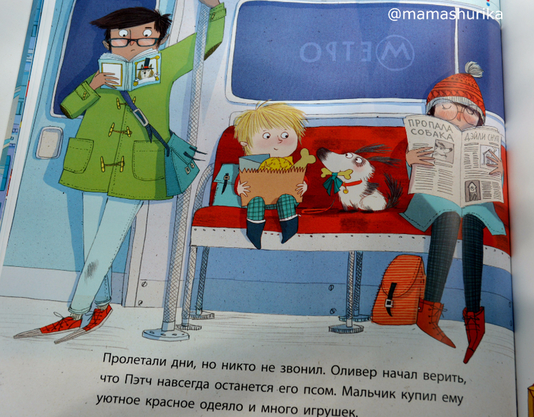 В этой книге меня полностью подкупили иллюстрации (чем то они мне напоминают иллюстрации Чижикова) , я давно смотрела на эту книгу, да всё откладывала покупку. В последний момент всё же решилась и приобрела её. Оказалось что и текст тут очень даже хороший , отличный перевод, интересный сюжет: мальчик Оливер недавно переехал в новый город и у него совсем нет друзей, как то гуляя , он находит на улице щенка, на щенке был ошейник с именем Пэтч, конечно мальчику сразу сало понятно что пёсик просто потерялся.