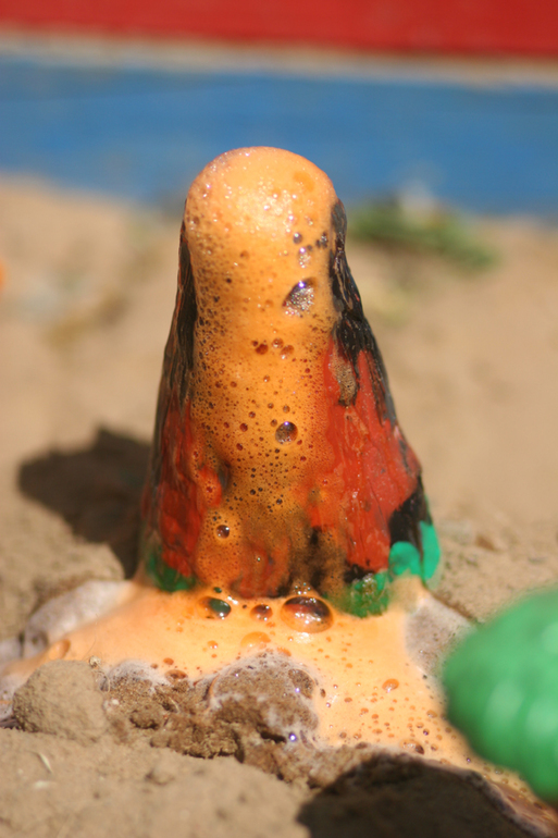 Конечно провели эксперимент с вулканом (уксус, сода, пищевой краситель):