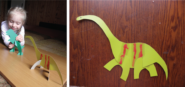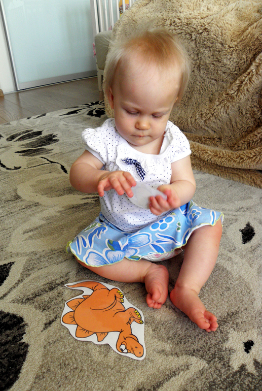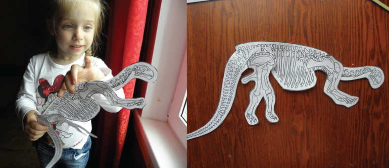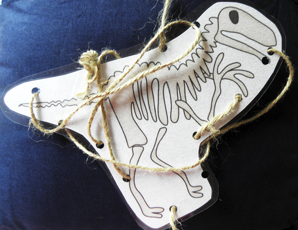 Заламинировала пару шнуровок и для Лизы и для Сони - скелет и сам динозавр. Лиза любит их таскать, пытается мять, рассматривает, показываю ей как просовывать шнурок в продыроколенную дырку: