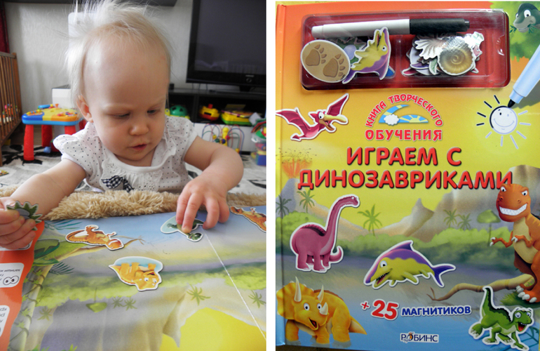Потом поиграла с магнитиками из более взрослой книги, позаимствованную из запасов Сони. Магниты прикрепляются прямо к страницам книги, можно создавать свои картины, а еще рисовать смывающимся маркером, пока что Лизиных умений хватило на отдирание этих магнитов со страниц. Магниты и маркер прилагаются, хорошая книжка для малышей: