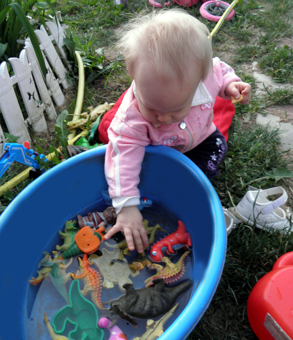 Спасали тонущих динозавром - вылавливала руками и доставала игрушки из таза с водой (оказлось супер увлекательно, ребенок был занят минут 20, вытащила всех до единого!):