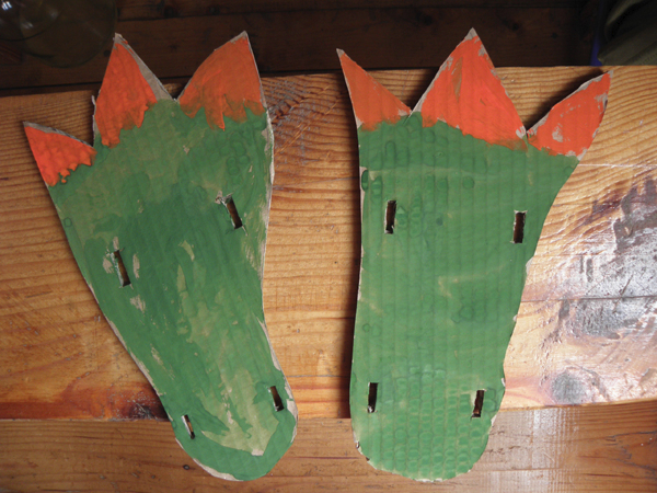 Сделали такие огромные динолапы! Папа вырезал сами лапы, Соня их раскрасила, протянули резинки для ног и можно топать)