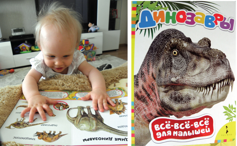 Для начала показала ей книжку про динозавров для малышей из-ва Росмэн - толстый картон, яркие картинки, очень понравилась: