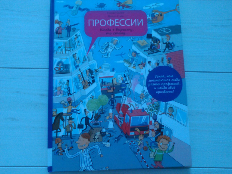 Эту книгу видела и тут и в иг. Купила. Действительно замечательная !! заявлено 300 профессий. Тематические развороты : ферма, школа, больница, спасатели, тц. Разворот с темой, а следом разворот с пояснение. Несколько строк о профессиях. Для трехлетки, считаю, что отличная книга о профессиях.