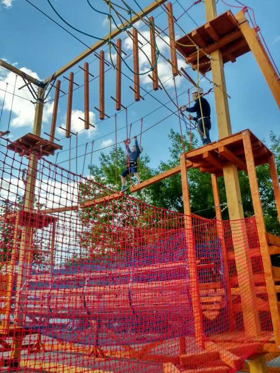 В нем три уровня. Первый - вообще ни о чем. Поэтому пошли на второй. Сын пошел в сопровождении мужа, надо было страховку перещелкивать и подсказывать иногда.