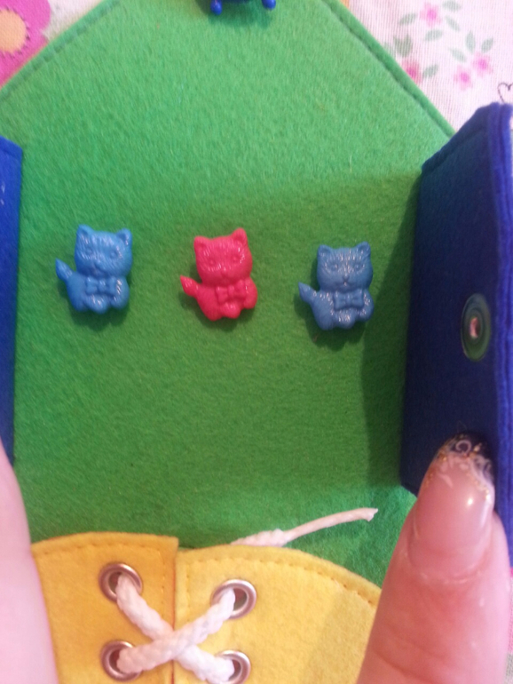 Размер книги 23*23 см, 7 листов (14 страниц, 2 обложки и 12 развивающих страничек), съемных деталей вышло 51 шт..