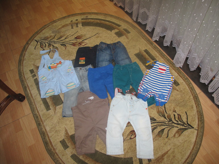 Джинсы 6-9 некст,большемерит,с подтяжками 9-12,зеленые штаны 6-9,синие 9 месяцев, темносиние теплын штаны 6-9. В полоску,голубые и коричневые комбезы от 3 месяцев.Пакет 1Боди сверху вниз 9 месяцев белый, остальные 3-6 месяцевРубашка 9 месяцев,кофты 6-9в полоску 3-6 месяцев.