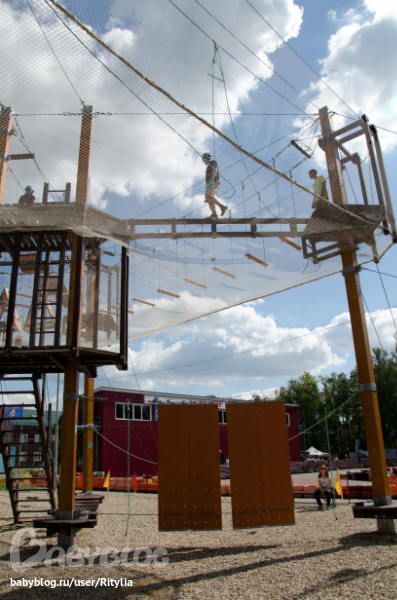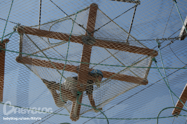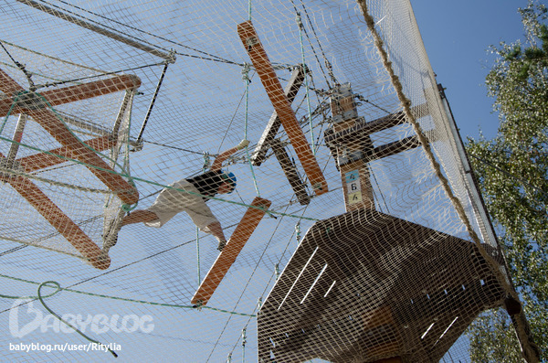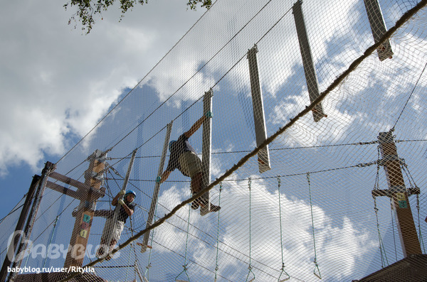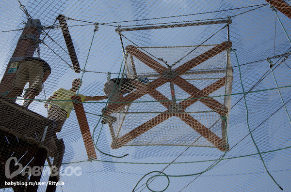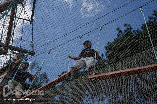 Старший отправился с папой на 2 уровень, а я с мелким на первом, параллельно фоткая их. На втором испытании мне честно говоря стало страшновато за сына, страховки нет - приземление на сетку.