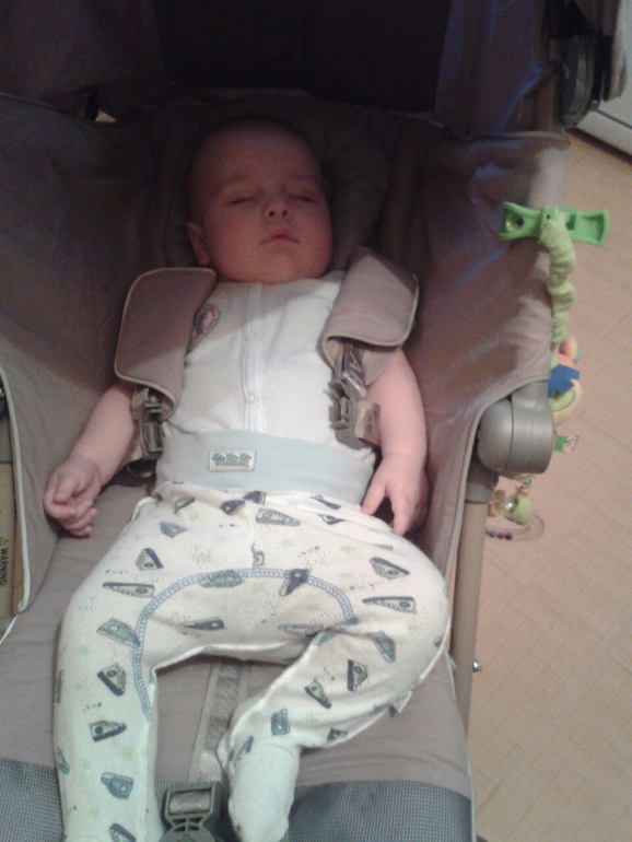 Этот чучелка встал в 6 утра, я его пол часа прибалтывала обратно заснуть, он сказал "нет". И вот, когда я встала и приготовила себе завтрак, он отрубился...даже ремни не пристегнуты, коляска возле меня стоит, думала 5 минут, пока поем, полежит и все. Где справедливость?