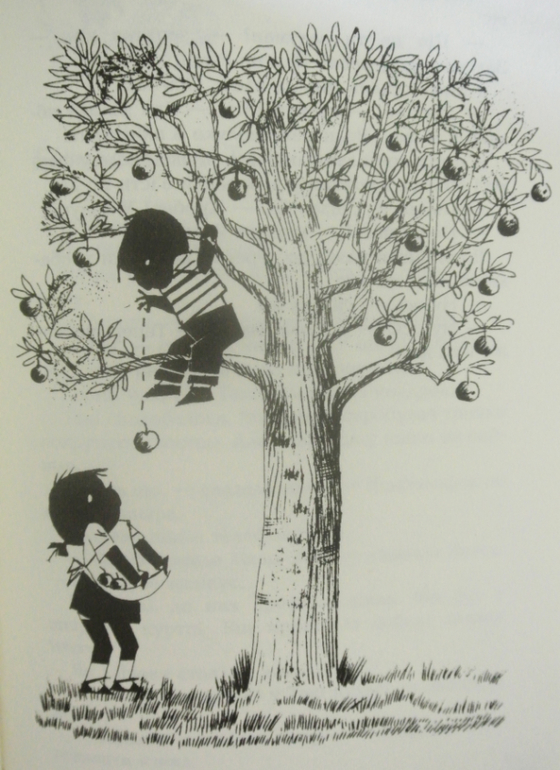 А в осеннем сборнике "Листик на паутинке" с рисунками Марии Зарембы яблочко покрыто тонким кружевом инея: