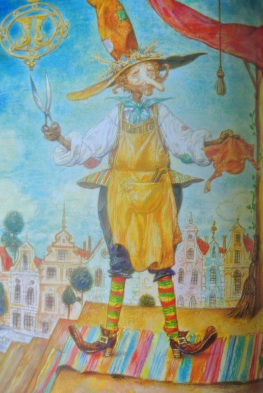 Еще в "Маленьких человечках" Антон Ломаев рисует сапожника в полосатых чулках на коврике цвета радуги: