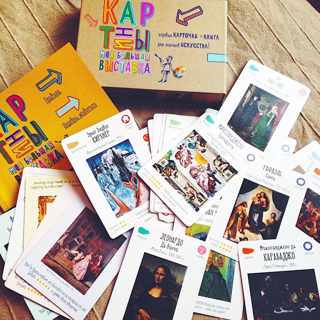 Настольная игра "Картины. Моя большая выставка" позиционирует себя как игра от 7 лет до 107 :) Но я её купила не для Димки, а для нас с Виталиком. Игра, с которой станешь умнее. Внутри - инструкция/она же книга с интересными фактами о художниках и картинах и 54 игровые карточки с краткой информацией о каждой картине. Правил игр несколько ( собрать стили и темы, собрать самые известные и ценные полотна, проверить себя на знание стиля и темы, отгадать тему выставки, отгадать художника и тд). Вообщем самое привлекательное в этой игре то, что довольно ёмко и симпатично рассказано о основных худ. стилях (ренессанс, борокко, классицизм, романтизм, реализм и многое другое), примеры этих стилей приведены в виде самых известных картин в мире, жемчужин :) Например знаете ли вы что "Сикстинская Мадонна" Рафаэля Санти написана в стиле ренессанс и ангелочков на картинах Рафаэля называют "путти"?.А еще карточки красивые, информативные и их приятно держать в руках.