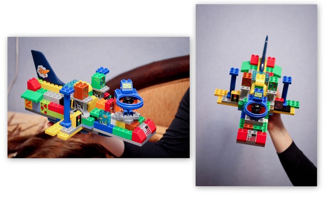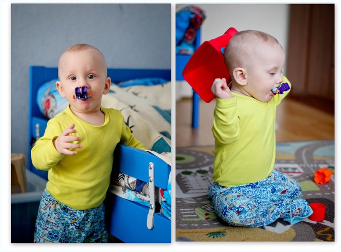 Очень удобно - часто разное, такое интересное, цветное. И потом, отнимать у старшего брата - это всегда весело. Засунет себе в рот и ходит важный такой в доль дивана)