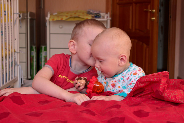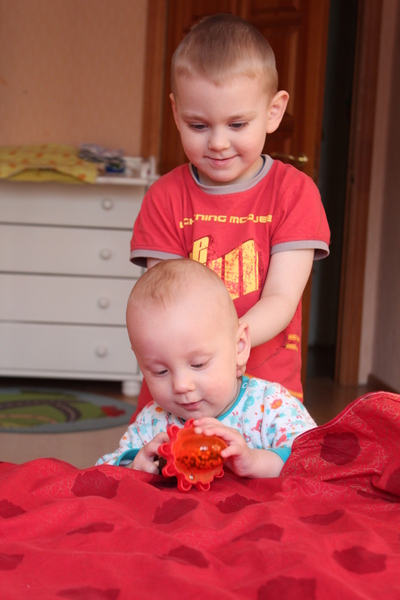 Дима братика любит да, он скучает, делится и нежно защищает его. Но любовь выражает ну оочень настырно и эмм..крепко: крепкие объятия, смачные поцелуи, братские любовные придавливания. Что конечно, малыша ну никак не устраивает и тот хнычет. Не нравится это и мне, а поэтому фразы: Дима, ну не надо/отстань от него/не дави так/не трогай за лицо! становятся моими коронными кричалками. Реально на языке плеш проели. Каждую минуточку, особенно когда возбужден мое старшее чадо лезет к младшему и втюхивает очередную нежность. Раньше думала случайно перебарщивает, без злого умысла, теперь уверенна, что тоже без злого. Но с умыслом. Пошутить, ну ведь это так прикольно обняться, навалиться и с грохотом завалиться с братом на пол, или оттянуть Артемкины ушки и попытаться ими вытереть Темину же слюну.