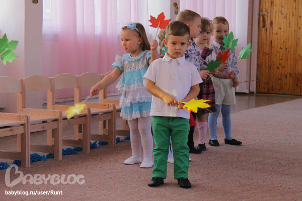 В понедельник сходили как обычно, а во вторник желание пойти в садик отпало. Как раз в этот день должен был быть праздник осени, к которому мы готовили туповатенькое четверостишье. Когда пришли, заявил, что идти в группу не хочет. Привезли его с мужем, поболтали немножко и отправили. Пришли к обеду, забрали, поспали дома часок... Просыпаться не хотел, не выспался, и в таком полусонном состоянии отправились на праздник. Ребенок ничегошеньки не желал делать, ни петь, ни танцевать, хотя с ними все готовили на музыкальных занятиях, поучаствовал в эстафете и пошел ко мне наблюдать происходящее со стороны.