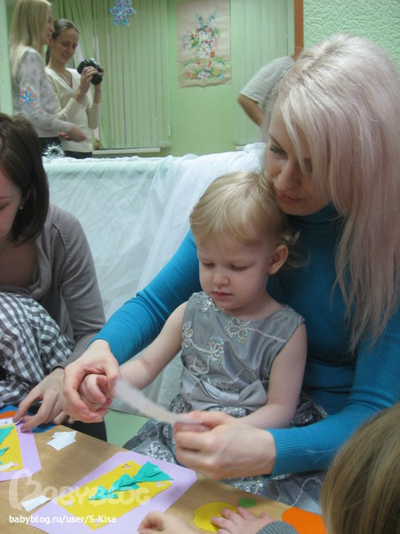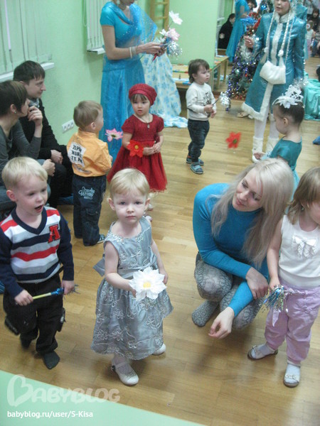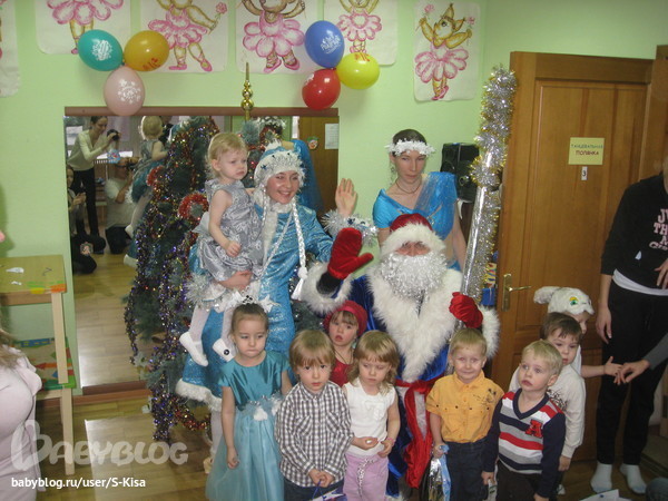 Собрали детишек около 12 человек в небольшой комнате, около стенки стояла небольшая елочка. Началось представление, пришла снегурочка (преподаватель нашей группы в центре развития) сначала традиционно поводили хоровод, потом началось все как на занятие, под песенку с занятий потанцевали, покидались снежками, поукрашали деревянную елочку (всем этим мы уже с середины ноября занимались на занятиях), потом поставили два маленьких столика и детки в тесноте делали открыточки родным, сделали открытки, опять в хоровод и звать деда мороза, пришел дедушка, поиграл в игру заморозить и начал дарить подарки. Подарили нам игрушку-уточку, в которую надо складывать различные фигурки (на подарки мы сдавали деньги). И все на этом сие действо закончилось, дед мороз со снегурочкой ушли, но потом вернулись, вспомнили, что не сделали общее фото.