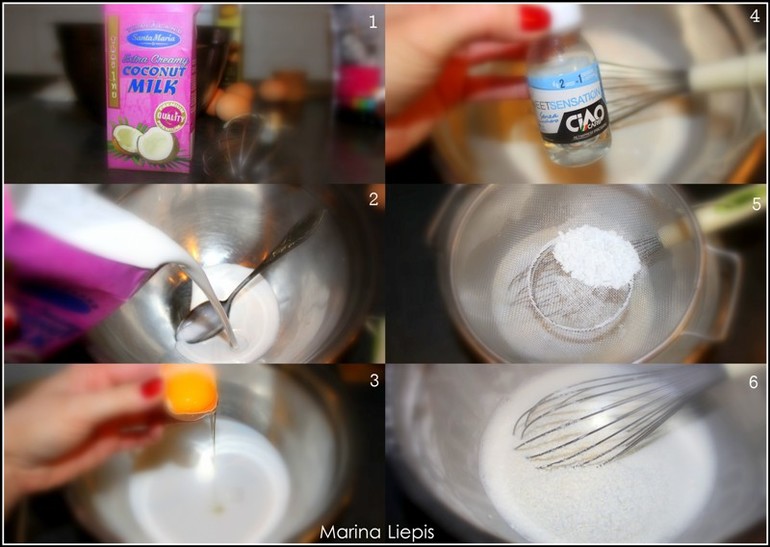 * Кокосовое молоко хорошенько взбалтываем с яйцами, белком, заменителем сахара или сахаром, просеиваем крахмал, засыпаем кокосовую стружку.