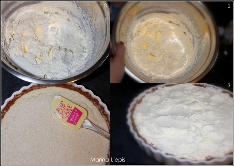 Так что, состав кокосового слоя изменила, основу из песочного теста замнила на корж из бананового печенья. Который предварительно не запекала и не подсушивала. Сахар не добавляла. В сливки для надёжности сыпанула закрепителя. Ира настоятельно не рекомендовала украшать торт сухой кокосовой стружкой. Нууу за свежим кокосом ради украшения я не пошла, да и поискать пришлось бы, а вот сухую стружку я таки сыпанула в начинку. От чего она стала похожа на Рафаэло.