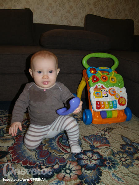 Играет в ладушки по настроению! Глазами ищет знакомые предметы, встает везде. Шагает в стороны вдоль дивана, кровати. Любит играть в мячики, неваляшка получает за все (она ее швыряет, подкидывает)