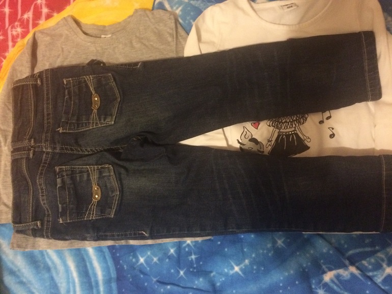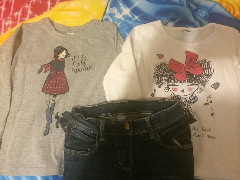 А Все вещи в хорошем состоянии. Джинсы можно подвернуть и носить от 96 до 108 см. На кнопке, ребенку очень удобно одеваться.