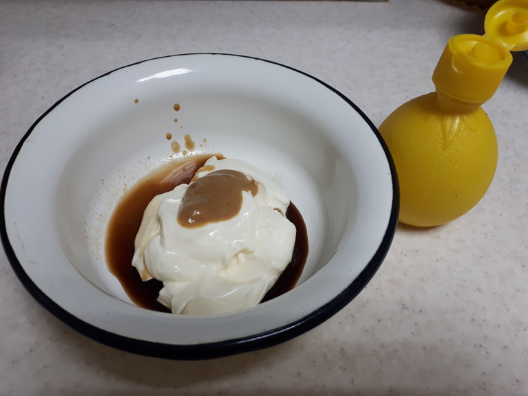 Взбиваем вилкой и поливаем наш почти готовый салат. Перемешиваем непосредственно перед едой.