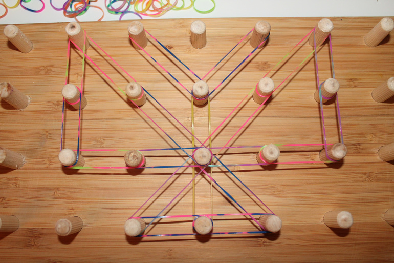 Одним словом, очень довольна результатом). Полезное развлечение получилось: развивает внимание, память и усидчивость, так как ребенку надо будет сосредоточиться на одевании резиночек и построении фигур; мелкую моторику. А еще это отличное упражнение на сенсорику, воображение и творчество (можно создавать рисунки как по схеме, так и придумывать самому), пространственное мышление.