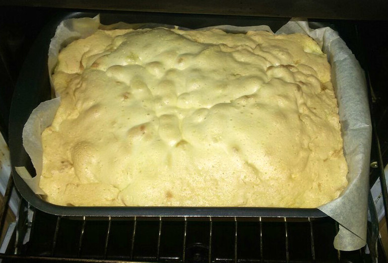 Все взбиваем как на шарлотку. Форму накрываем бумагой, смазываем маслом, выкладываем порезанную на кусочки дыню, заливаем тестом и ставим в горячую духовку...