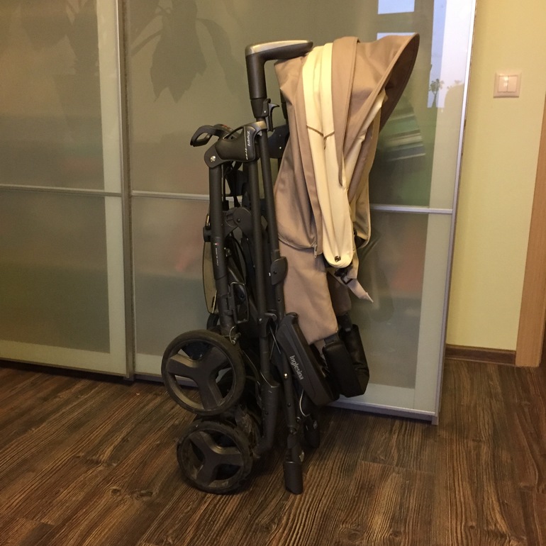 Удобно складывается и раскладывается одной рукой. Так выглядит в сложенном состоянии, дома много места не занимает и вмещается в багажник легкового автомобиля оставляя еще много места.