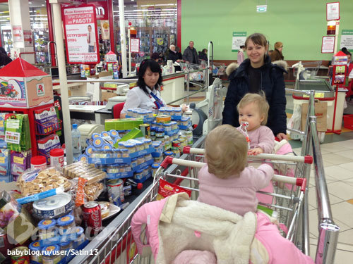 Итак, сегодня мы впервые все вместе отправились за покупками в Ашан. Дочи в первый раз покатались в продуктовых тележках. Постоянно вертелись, все хотели увидеть, потрогать, попробовать на зубок :) Очень забавно тыкали на полки пальчиками и что-то говорили по-своему. Даша даже выбрала себе футболку :)