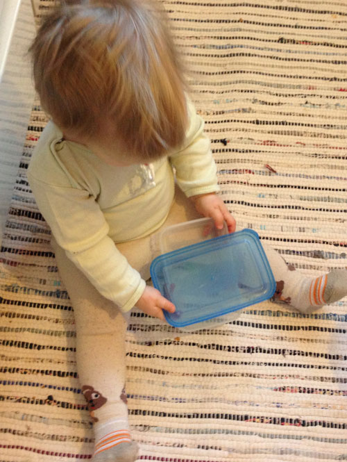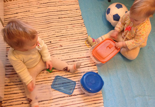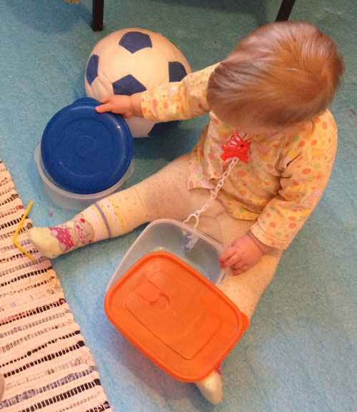 Продолжаем с простой игры - "найди нужную крышку". Я дала им три пластиковые емкости разных размеров и крышки к ним. Они у меня любят от всего крышки отвинчивать, так что разобрались с задачей очень быстро. И так же быстро игра им надоела :)