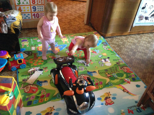 Сначала дочи осваивались и катали его по квартире. Потом Алена оседлала транспорт и начала носиться по квартире. Правда, повороты пока не освоила, поэтому маме приходилось бегать за ней и оттаскивать от стен и мебели. Даше не проявила сильного интереса к транспорту, но немного покаталась с папой.