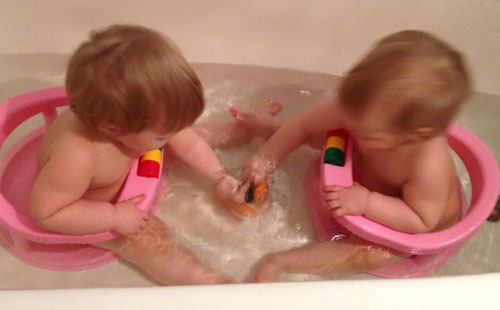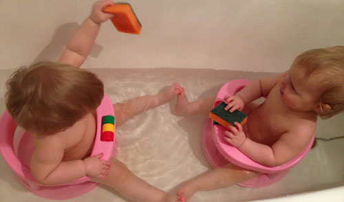 И снова у нас игры в ванной. Хотела научить дочек выжимать воду из губки. Но, видимо, пока они для этого маленькие - не поняли как сжимать пальчиками. Зато им понравилось просто опускать губки в воду, а потом смотреть, как стекает вода.