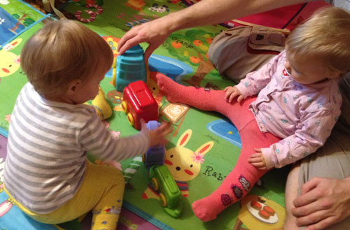 Потом играли в похожую игру, но уже мама прятала игрушку в ладони и предлагала детям угадывать, в какой именно: