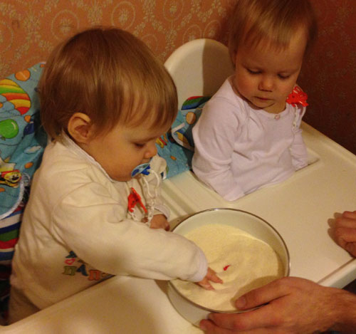 А Алена вообще решила, что не царское дело в манке ковыряться и ручки пачкать. После того, как несколько раз дотронулась до крупы, спрятала ручки под стол и ни в какую не хотела доставать и трогать манку...