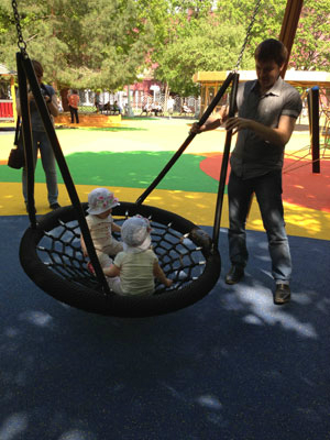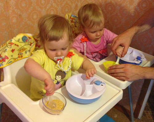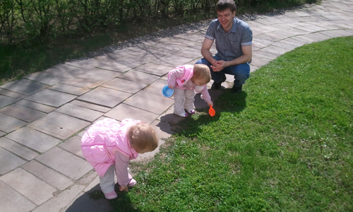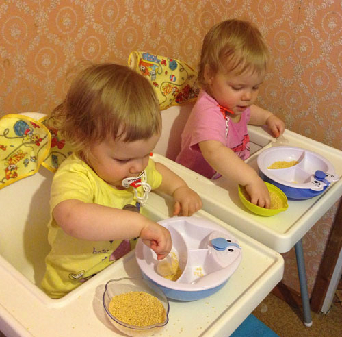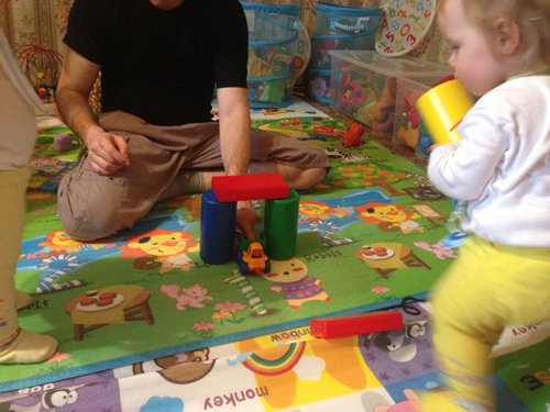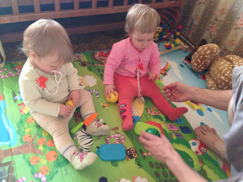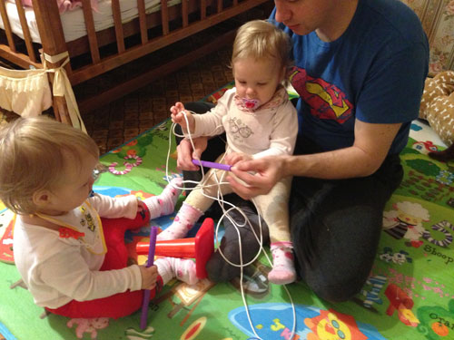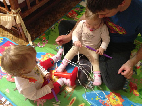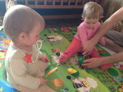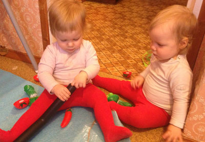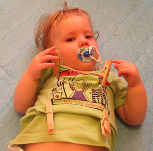 Я была уверена, что сегодняшняя игра должна понравиться детям, а на самом деле она практически не вызвала энтузиазма. Задумка такая: прикрепить к одежде детей (и своей) прищепки, которые они смогут друг с друга (и с мамы) снимать.