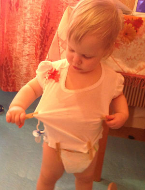 Алене не понравилось, что к одежде что-то цепляют. Она с недоуменным видом все это с себя снимала: