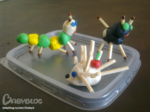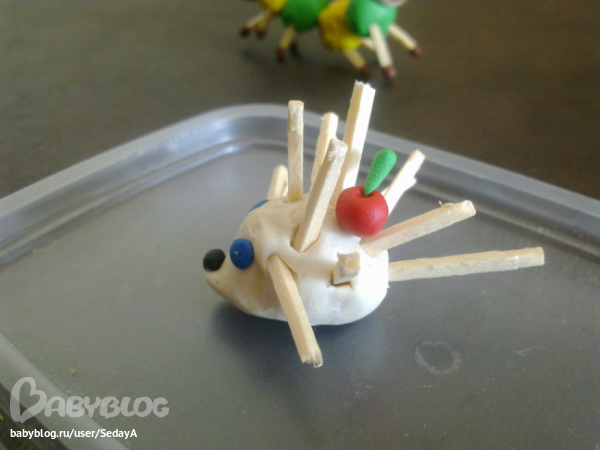 эта дружная компания сегодня слепилась. голову бычку и ежика катала мама, остальное под маминым руководством пришпандоривал Сеня)))) и тело быку, шарики для гусеничики сам катал)))) я только мелки детальки для глаз готовила, а он их расклеивал)