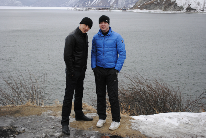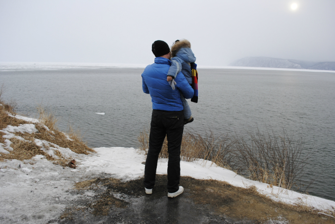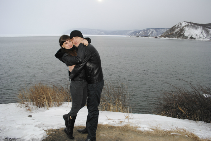 фото на фоне места, где Ангара вытекает из Байкала. оно никогда не замерзает. там вдали видно покрытый льдом Байкал