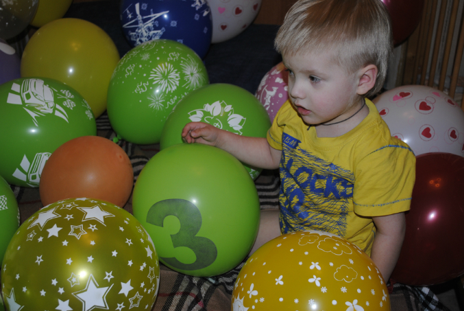 накануне мама с Колей (мч), дули шарики в колчиестве 30 штук))) точнее Коля дул, а мама завязывала (шарики до сих ор под ногами путаются, зреет план перелопать их