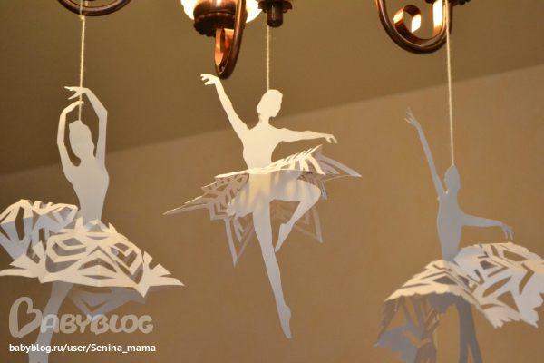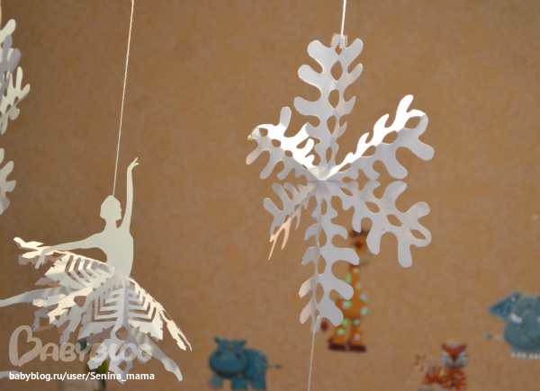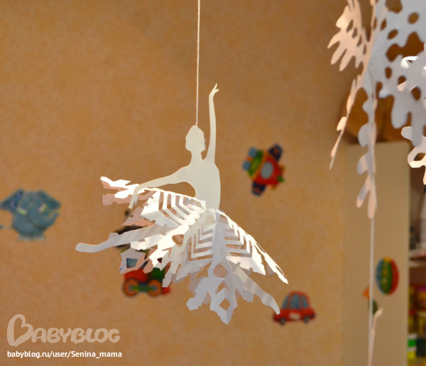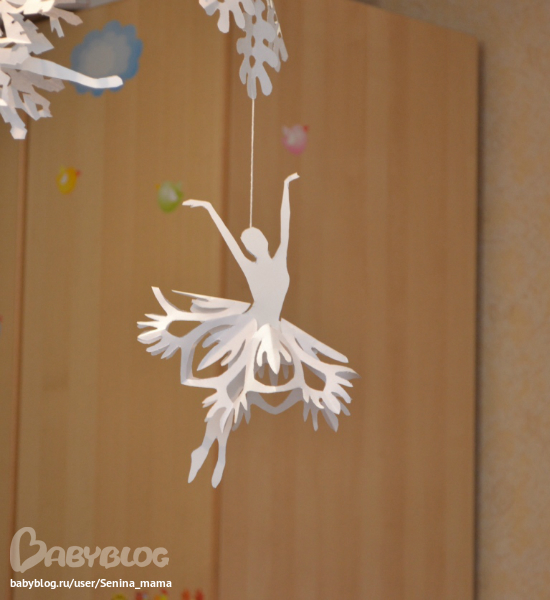 Спасибо! На самом деле оч просто! Балерину вырезаем по шаблону из белого картона. Шаблоны балерин есть, их нужно просто распечатать. А снежинки любые можно навырезать, главное чтобы серединка вырезана была.Схемы снежинок тоже есть там по ссылке. Потом снежинку аккуратно надеваем на балерину и все!:) На ниточку подвешиваем куда хотим:)