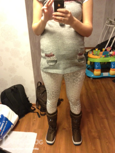 Термолегинсы на сейчас, потом под зимние штаны поддевать можно будет и теплющие непромакаемые сапожки на овчинке, оч.удобные - легко одеваются и так же легко снимаются) Опять же брала на будущее для длительных прогулок) Сегодня еще куртку зимнюю достану для интереса, застегнется ли))) Остался всего месяц и одежду для беременных совсем уже не хочется покупать, а как вы справляетесь?