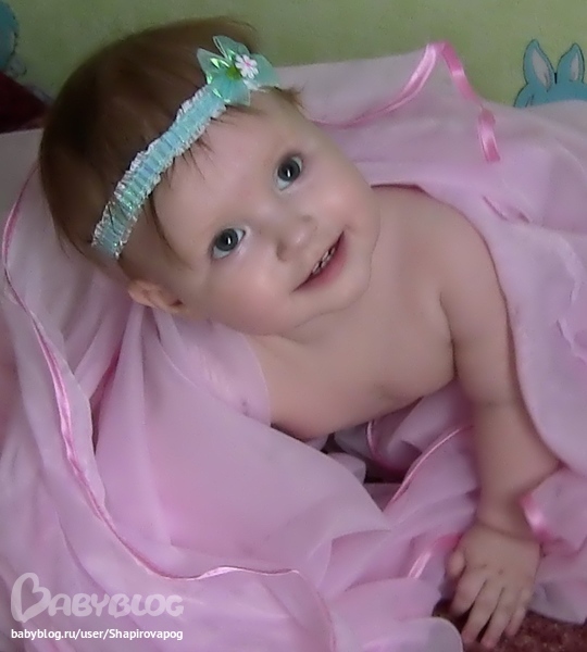 Лизуля научилась садится с положения полу лежа,и частично ползать,делает почему то пару шажков а потом вытягивается длиной колбаской и дрыгает ручками и ножками))Еще иногда машет пока-пока,делает ладушки пяточками))активно стучит ладошкой по чему небуть после слова "ляп" ))