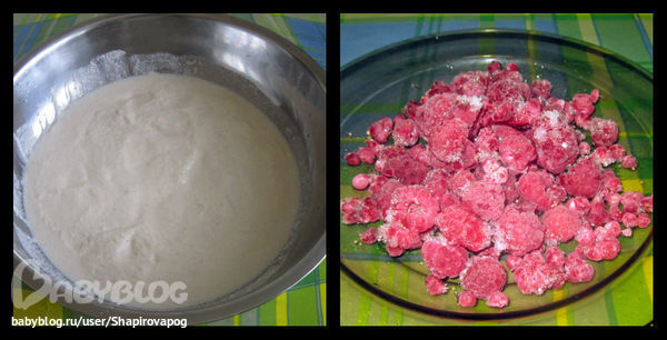 Перетираем яйца с сахаром, добавляем уже настоянную манку с молоком, высыпаем малину, перемешиваем, добавляем муку и соду.тесто должно получится довольно жидким! Выливаем все, на предварительно смазанный протвень и выпекаем 30 мин, при температуре 180 гр)и все готово)можно кушать))